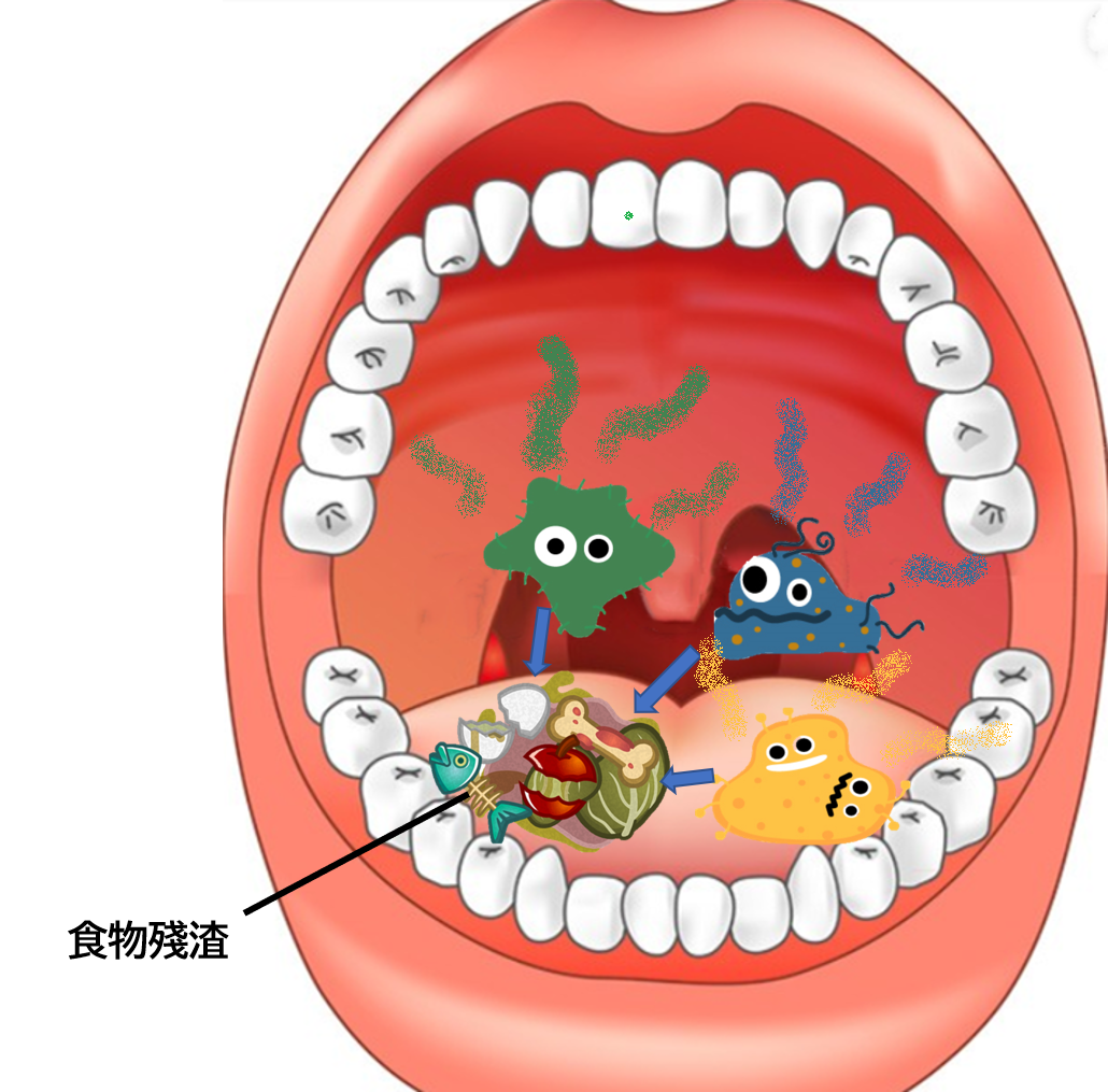 厭氧性細菌在分解食物殘渣的時候會製造含硫的氣體這個氣體就是造成口臭的元兇。