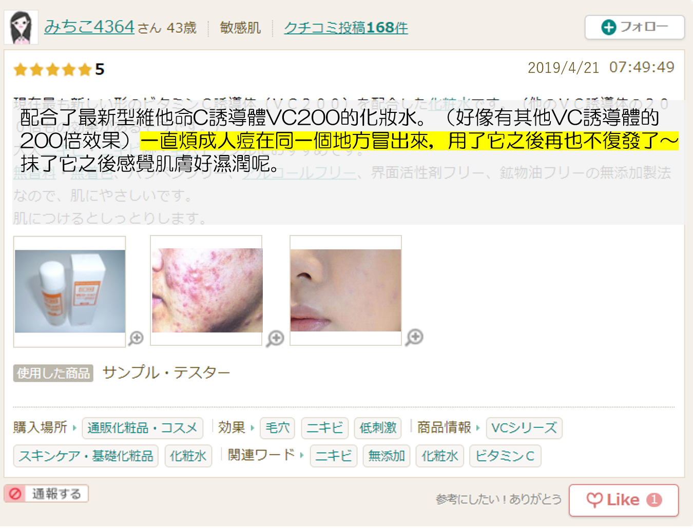 青春期的時候沒有長痘。。但開始工作以後,又因為生活習慣不規律,工作壓力太大開始長成人痘。不好好注意就爆痘。。經過皮膚科醫師的推薦,用了日本這款VC凈痘化妝水後,膚況就明顯變好了!使用1個月後,痘痘消失了,痘痕也幾乎不見。,而卻不會有新痘痘長出來。真的是我用過所有消除痘痘產品中最有效的!VC200力量好強大,比我之前在醫院開的藥還好用。