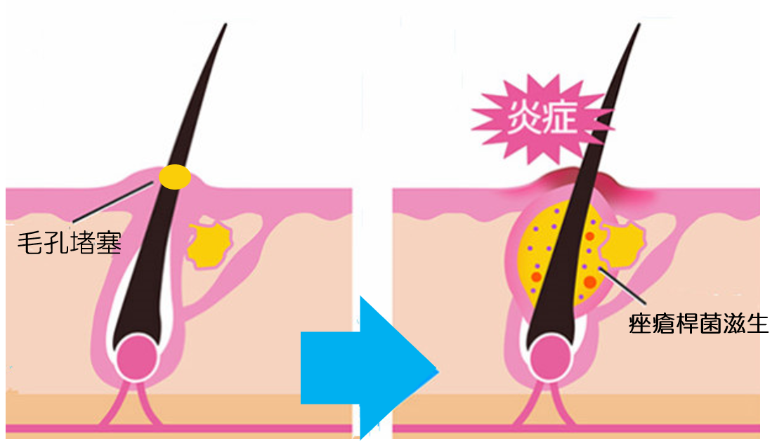 毛孔堵塞之後,毛囊內的痤瘡桿菌(痘痘菌)就會開始大量的滋生,
